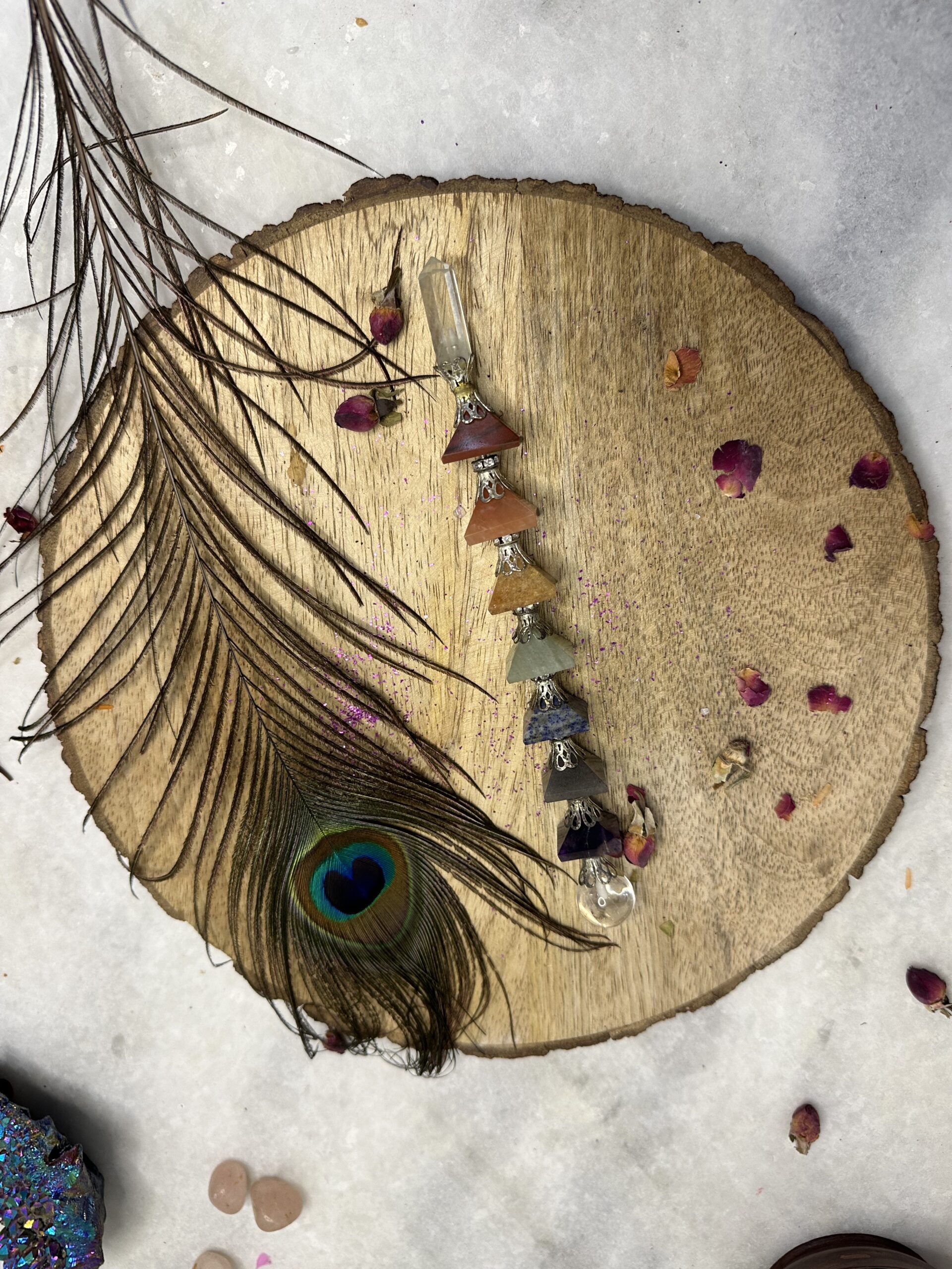 Introducing our 7 Chakra Pyramid Wand, a powerful instrument for balancing and activating your body’s energy centers. Crafted with exquisite attention to detail, this wand features seven gemstones corresponding to each of the chakras, meticulously arranged within a pyramid-shaped crystal. As you work with this wand, you’ll experience the harmonizing effects of its energy, facilitating spiritual alignment and inner equilibrium. Harness the transformative energy of the universe and elevate your spiritual practice with our 7 Chakra Pyramid Wand, a beacon of light on your journey to self-discovery and enlightenment.