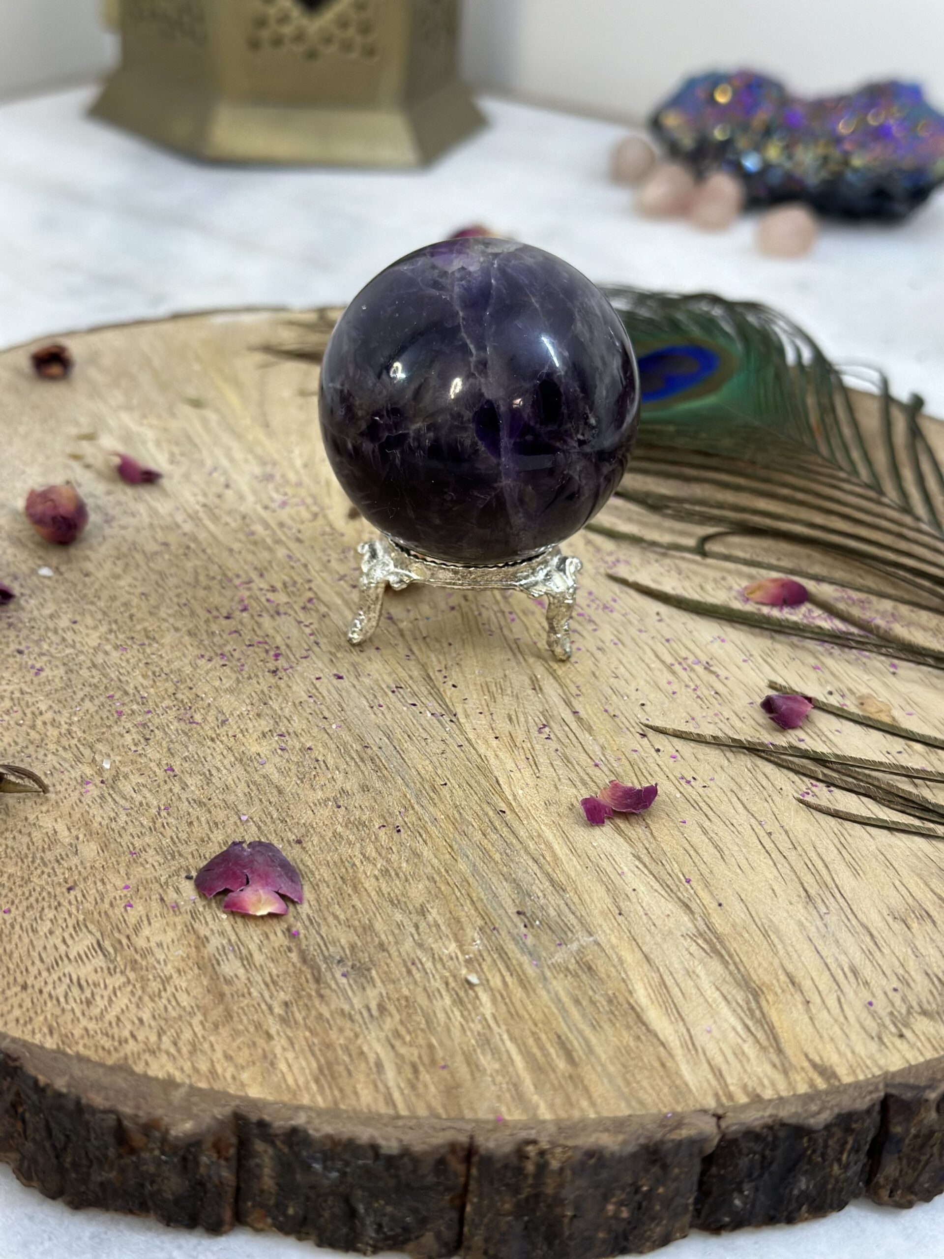Behold the mesmerizing beauty and profound energy of our Amethyst Crystal Ball. Crafted from premium amethyst gemstone, this crystal ball gleams with vibrant hues of purple, captivating the eye and soothing the soul. Known for its powerful spiritual properties, amethyst channels divine energy to enhance intuition, promote clarity of mind, and invite serenity into your space. Whether used for scrying, meditation, or as a stunning decorative piece, our Amethyst Crystal Ball radiates tranquility and elevates the energy of any environment. Embrace the magic of amethyst and unlock the secrets of the universe with this enchanting crystal sphere.