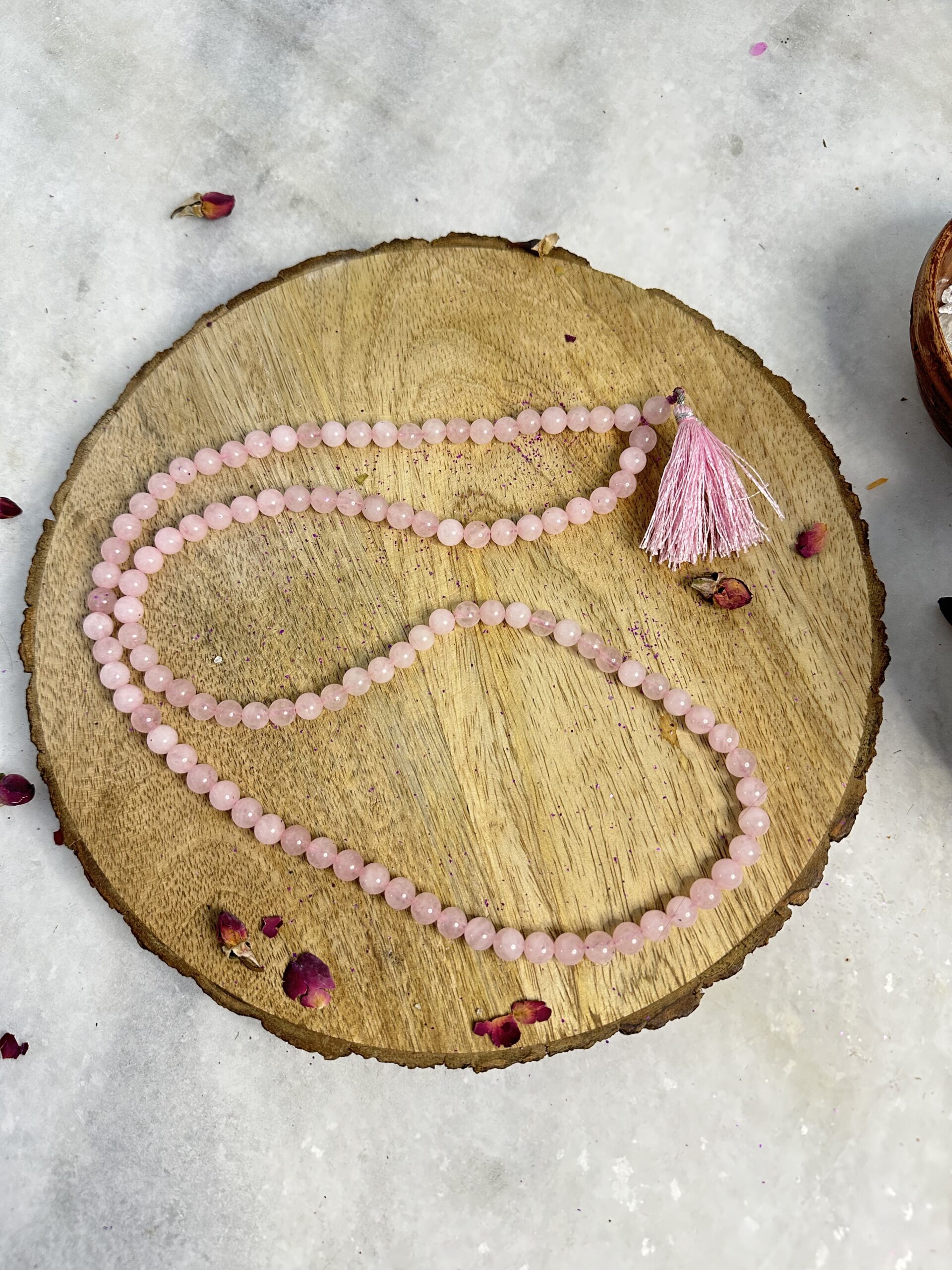 Experience the divine embrace of love and compassion with our Rose Quartz Rosary Jaap Mala. Meticulously handcrafted, each bead is made from genuine rose quartz, radiating soft pink hues that embody universal love and healing. This sacred rosary is designed to deepen your spiritual practice, facilitating meditation, prayer, and reflection. Rose quartz, known as the stone of unconditional love, opens the heart chakra, nurturing self-love, forgiveness, and emotional healing. Whether used for mantra chanting or as a symbol of devotion, our Rose Quartz Rosary Jaap Mala serves as a powerful tool for cultivating inner peace and divine connection. Embrace the gentle energy of rose quartz and infuse your spiritual journey with love and harmony with this exquisite rosary.